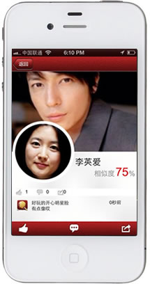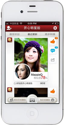 开心明星脸是公司自主研发运营的娱乐类APP。利用目前最先进的人脸识别技术,根据人脸的轮廓,肤色,纹理,质地,色彩,光照等特征来计算相似度. 该应用曾被apple推荐过,在appstore娱乐榜最佳排名16位。